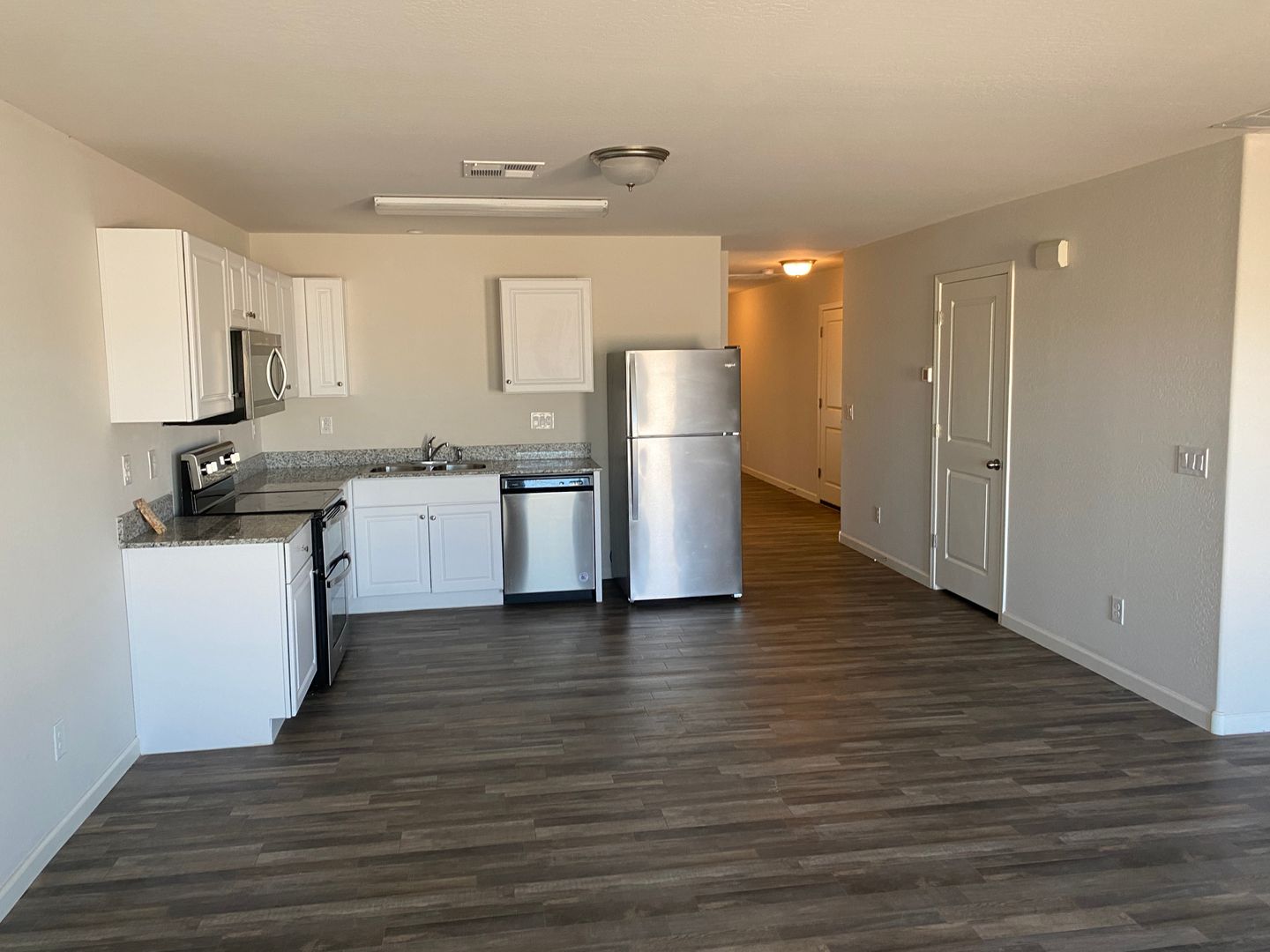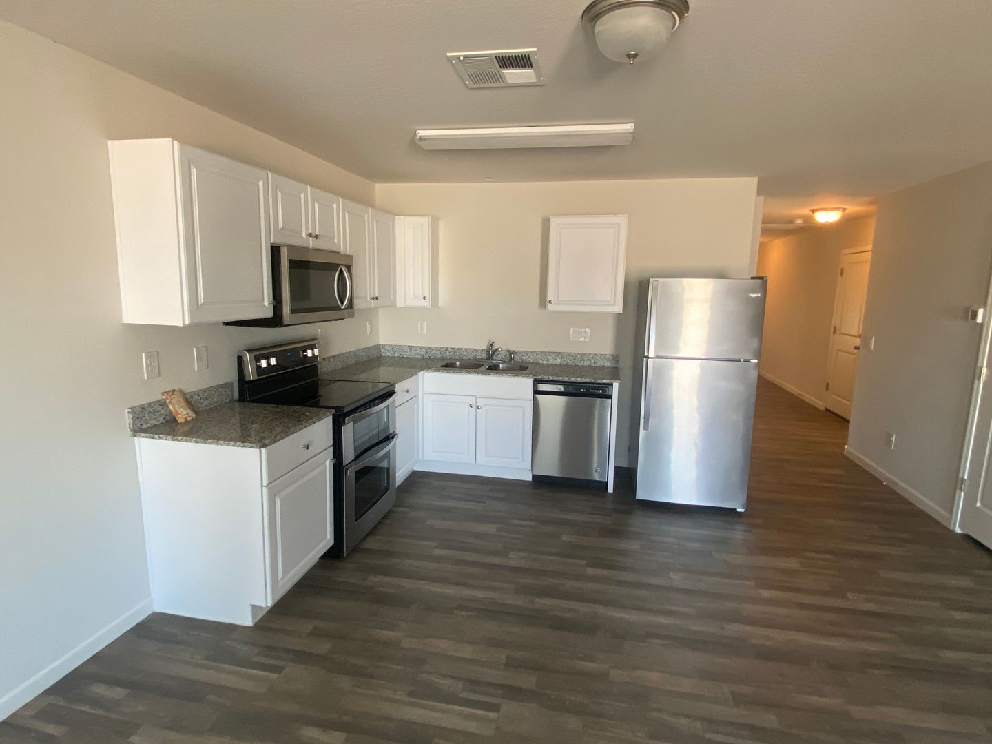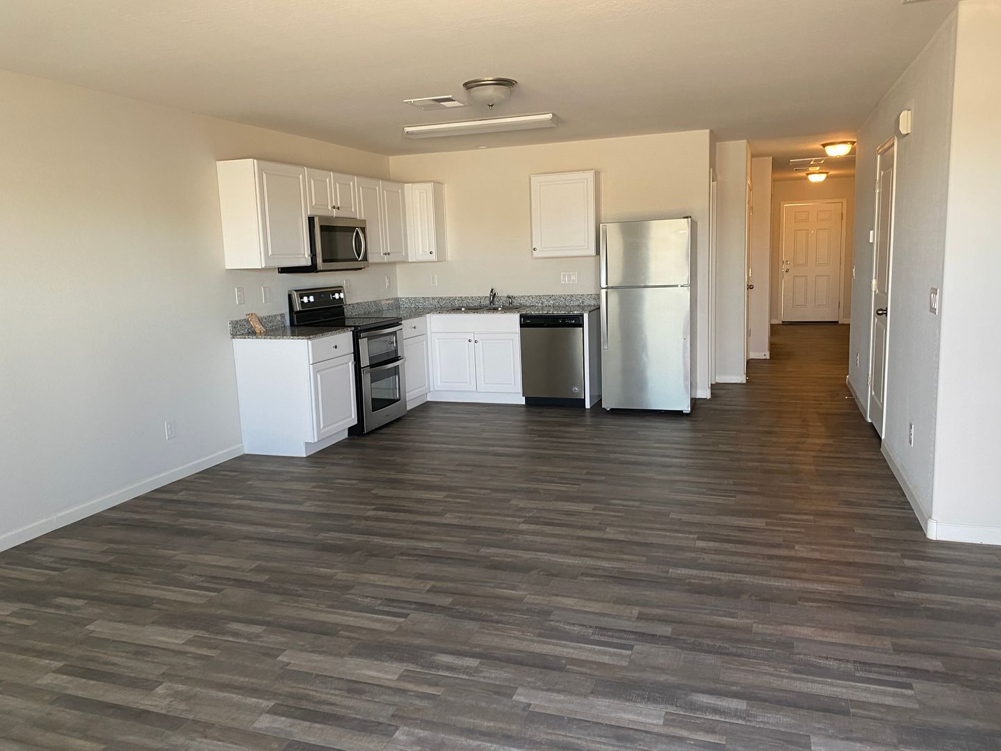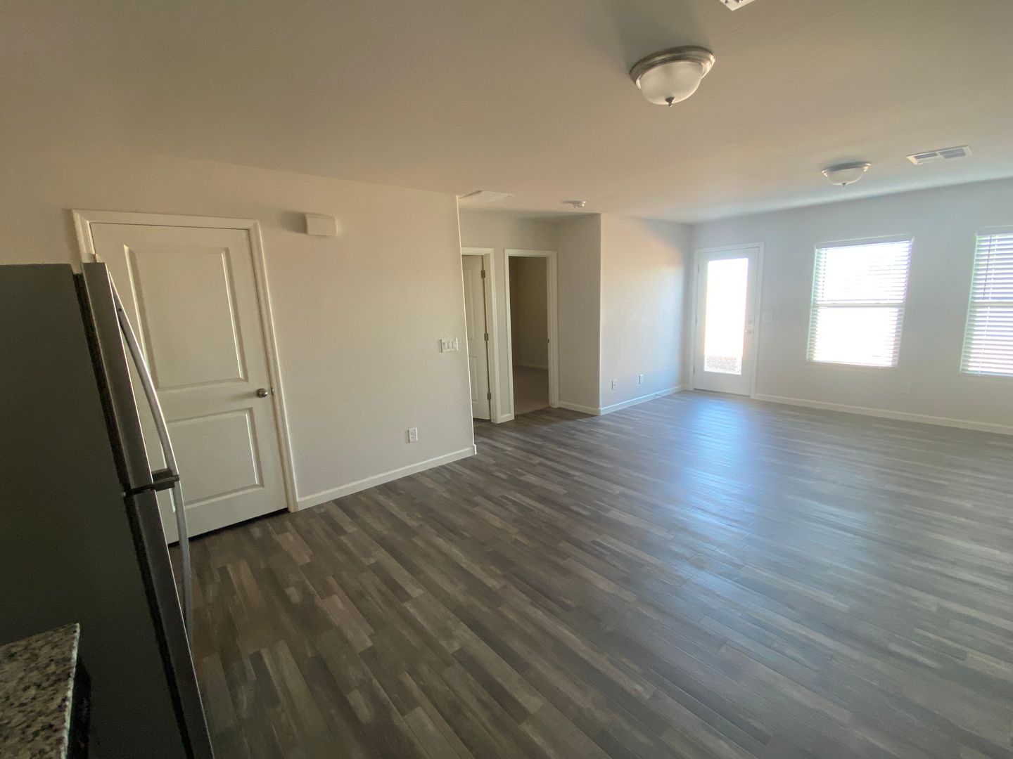 Spacious greatroom is next to kitchen. Updated finishes with vinyl wood flooring throughout except for carpet in bedrooms. Kitchen has granite countertops and stainless appliances plus plenty of cabinet and counter space. Washer and dryer included plus 1 car garage. Home is in excellent condition. Tenant is responsible for maintaining all landscaping including regular weed removal.