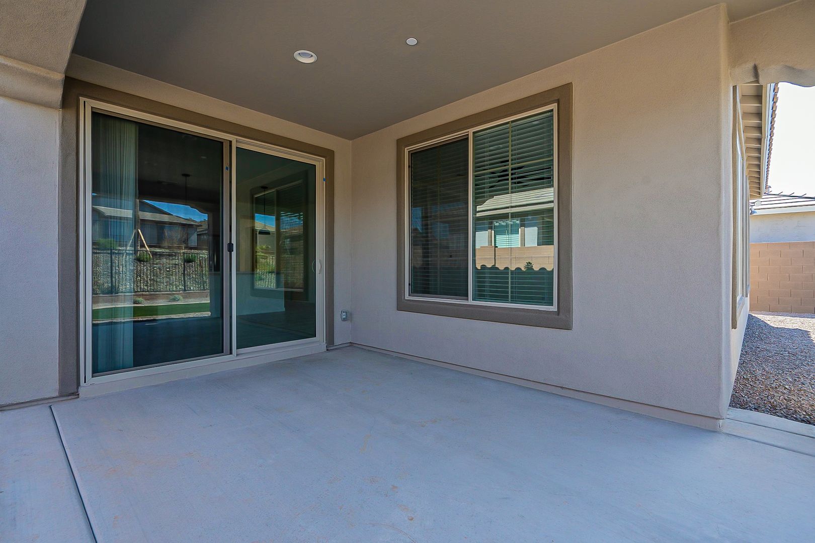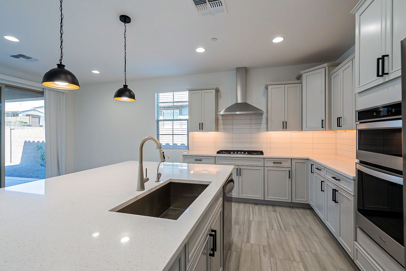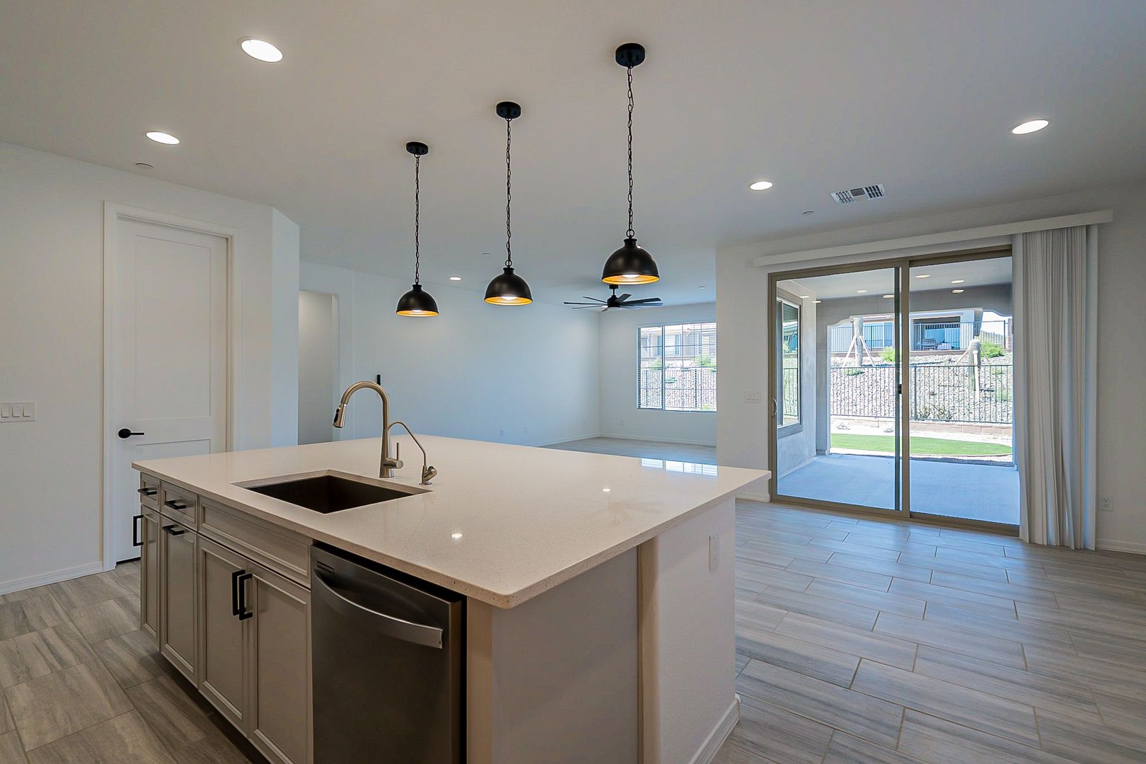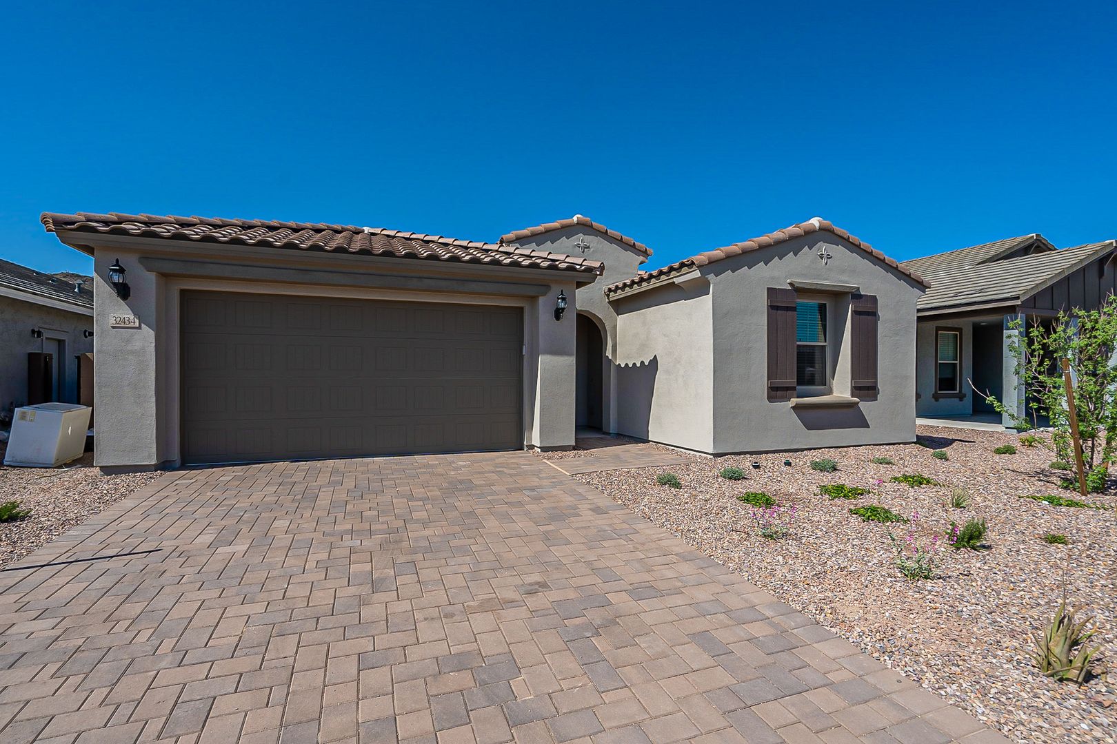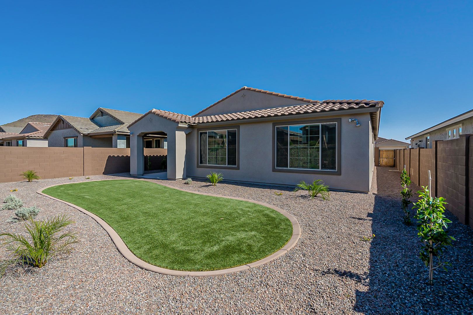 This 2500 SF new build has it all. Of course, everything is new with neutral designer colors and finishes. Large great room looks out over backyard, and at the other end is the gorgeous kitchen. There are lots of cabinets and plenty of counter space. A huge island allows for prep space as well as room for 4 stools, and there's a generous pantry. There's a formal dining room , 3 regular-sized bedrooms, and a very large master. The master bath has a double vanity with great counter space, a big walk-in closet, and a spacious walk-in shower. Ceiling fans throughout, all tile except carpeted bedrooms. The backyard is mainly gravel with a circular green area of astro-turf. The home is located in the Peoria School District which include Lake Pleasant Elementary grades PK-8 distance .1 miles. Liberty High School Grades 7-12 Distance 7.2 miles.